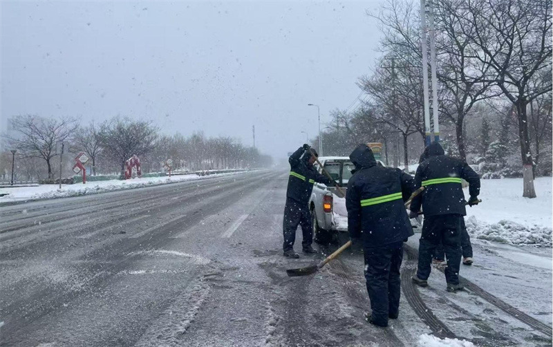 根據(jù)氣象部門預(yù)警,公司未“雪”綢繆,提前啟動應(yīng)急預(yù)案,集結(jié)人員、設(shè)備、融雪劑在包保路段待命。